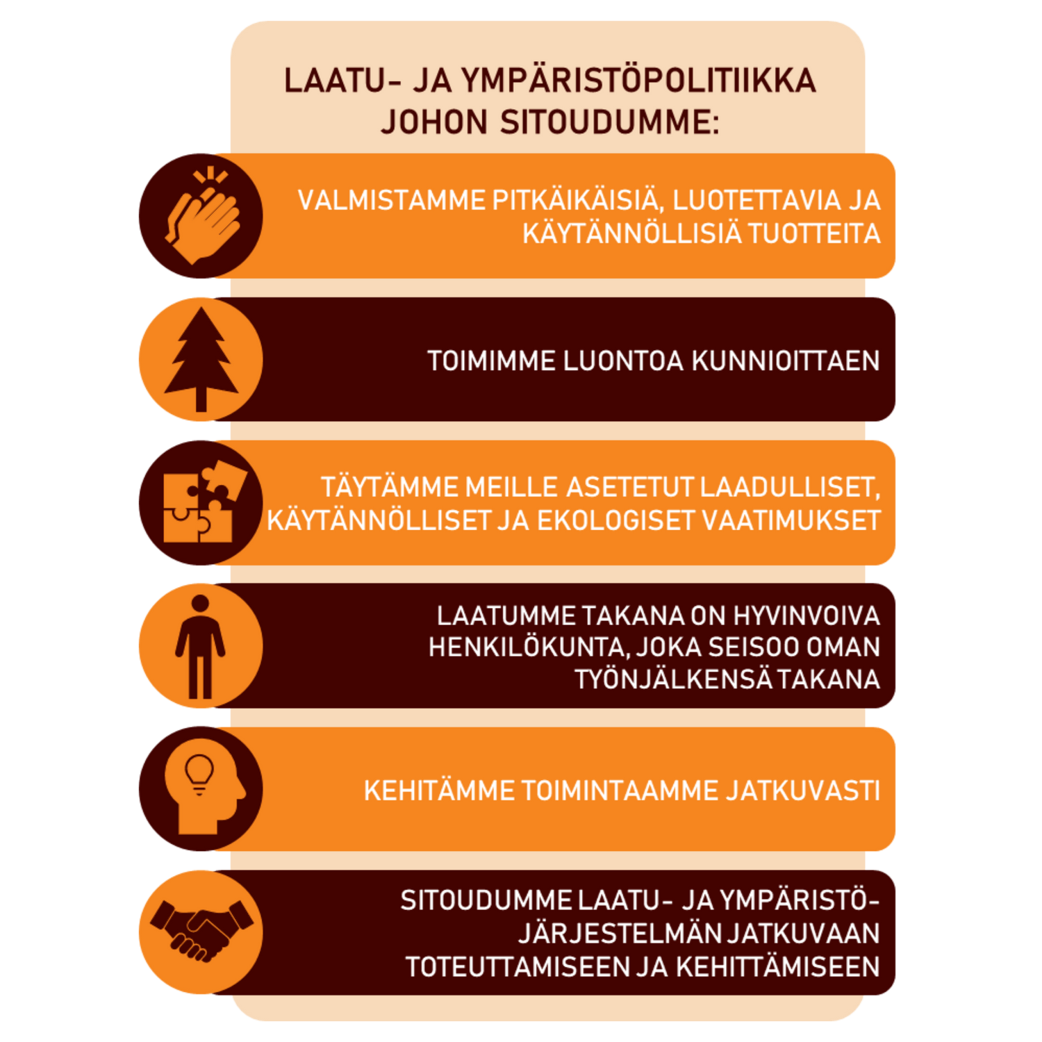 Tarjoamme turvallisen työympäristön, jossa mahdolliset tapaturmariskit on minimoitu. Kuulemme työntekijöitä työympäristön ja työskentelyn kehittämiseksi, ja pyrimme vastaamaan tarpeisiin parhaamme mukaan.