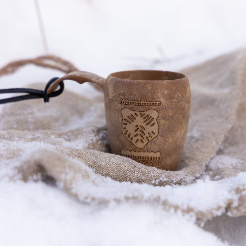 KUPILKA 5 - SNAPSIKUPISTA nautit niin espresson, inkiväärishotin kuin lempiliköörisi. Kahvaan solmitun poronnahkanauhan avulla korumaisen kaunis ja siro kuppi pysyy tallessa kaulaan ripustettuna.